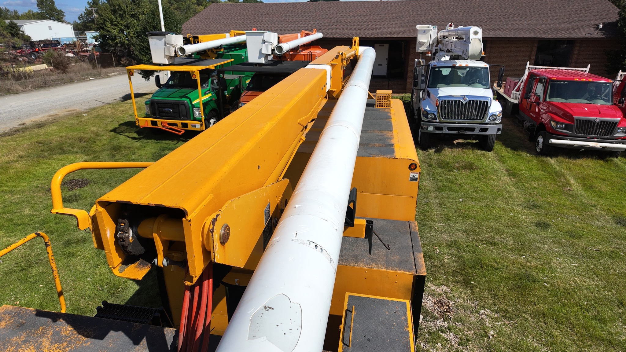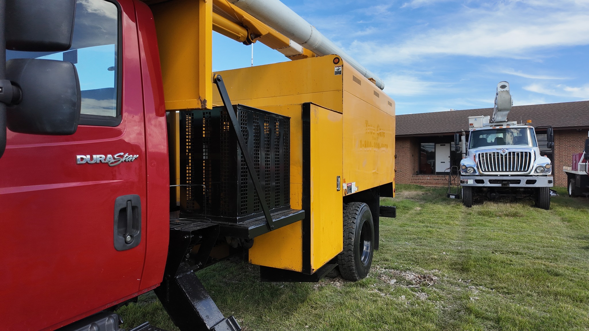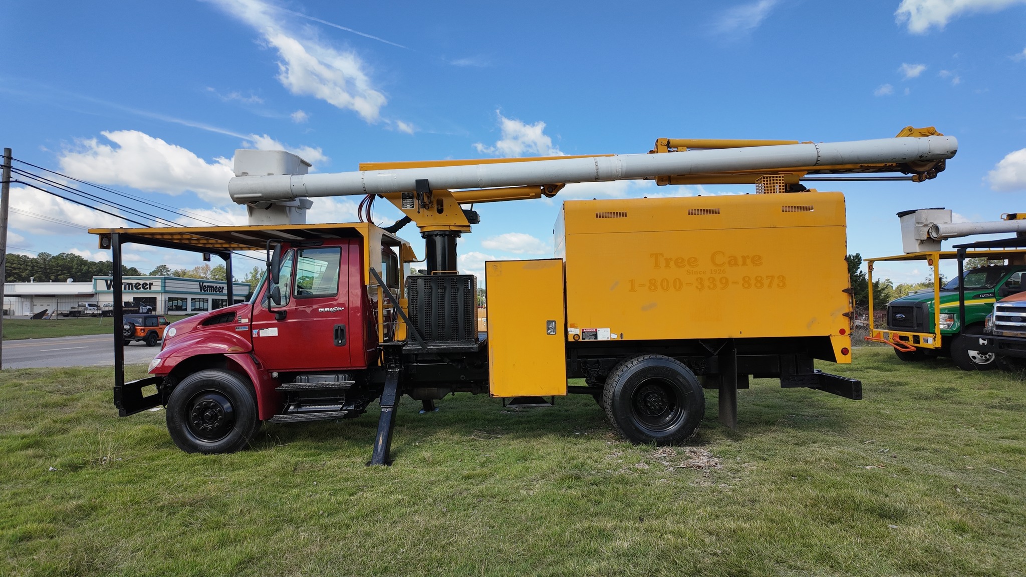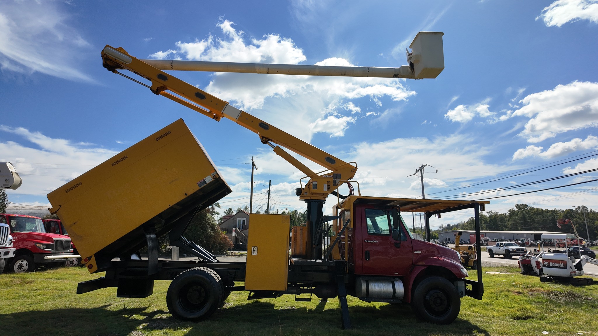 Heavy-duty International bucket truck equipped with a 65-foot working height boom, perfect for tree service, utility work, and forestry operations. Comes with a spacious forestry-style chipper dump bed – ideal for hauling debris, logs, and wood chips. Built tough for the field, but easy to drive with its automatic transmission.